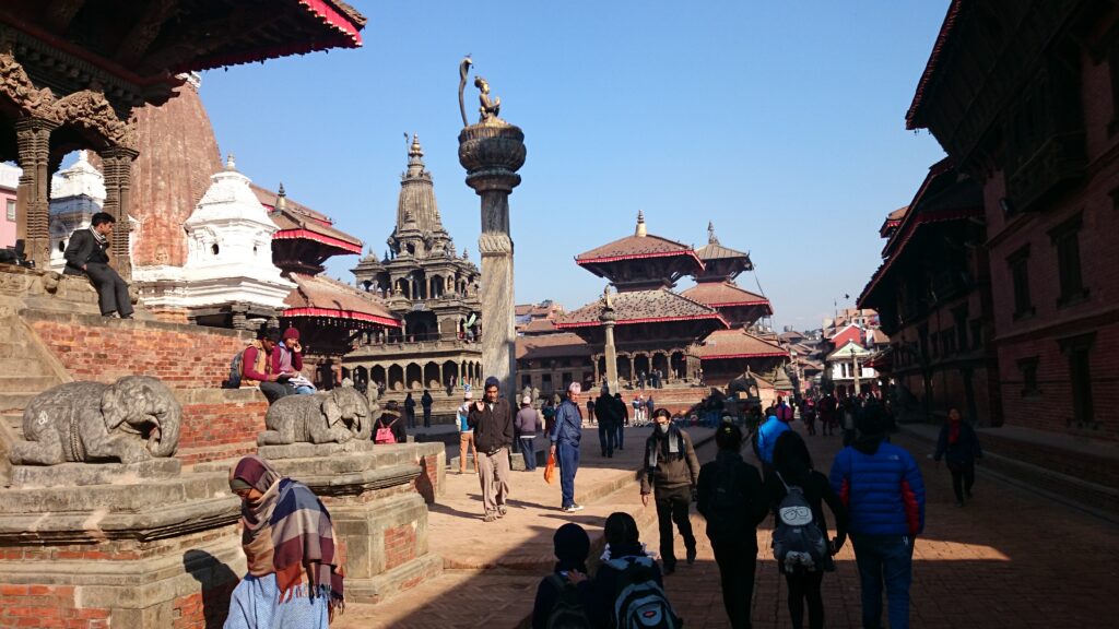 Plaza Durban. Estos complejos arquitectónicos que constituyen todavía los centros históricos de las ciudades de Katmandu, Patan y Bhadakpur, están formados por los propios palacios reales así como un sinfín de templos hindúes y budistas, grandes fuentes y estatuas.Los edificios de ladrillos y madera, algunos en forma de pagodas, de la plaza Durbar de Katmandu,
