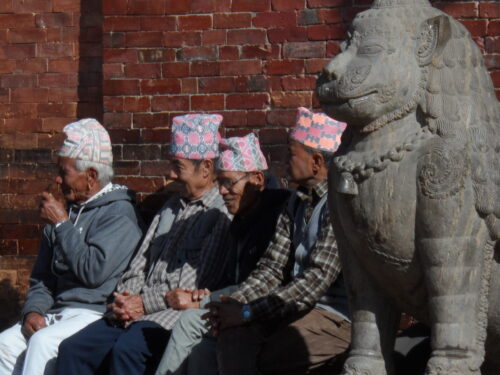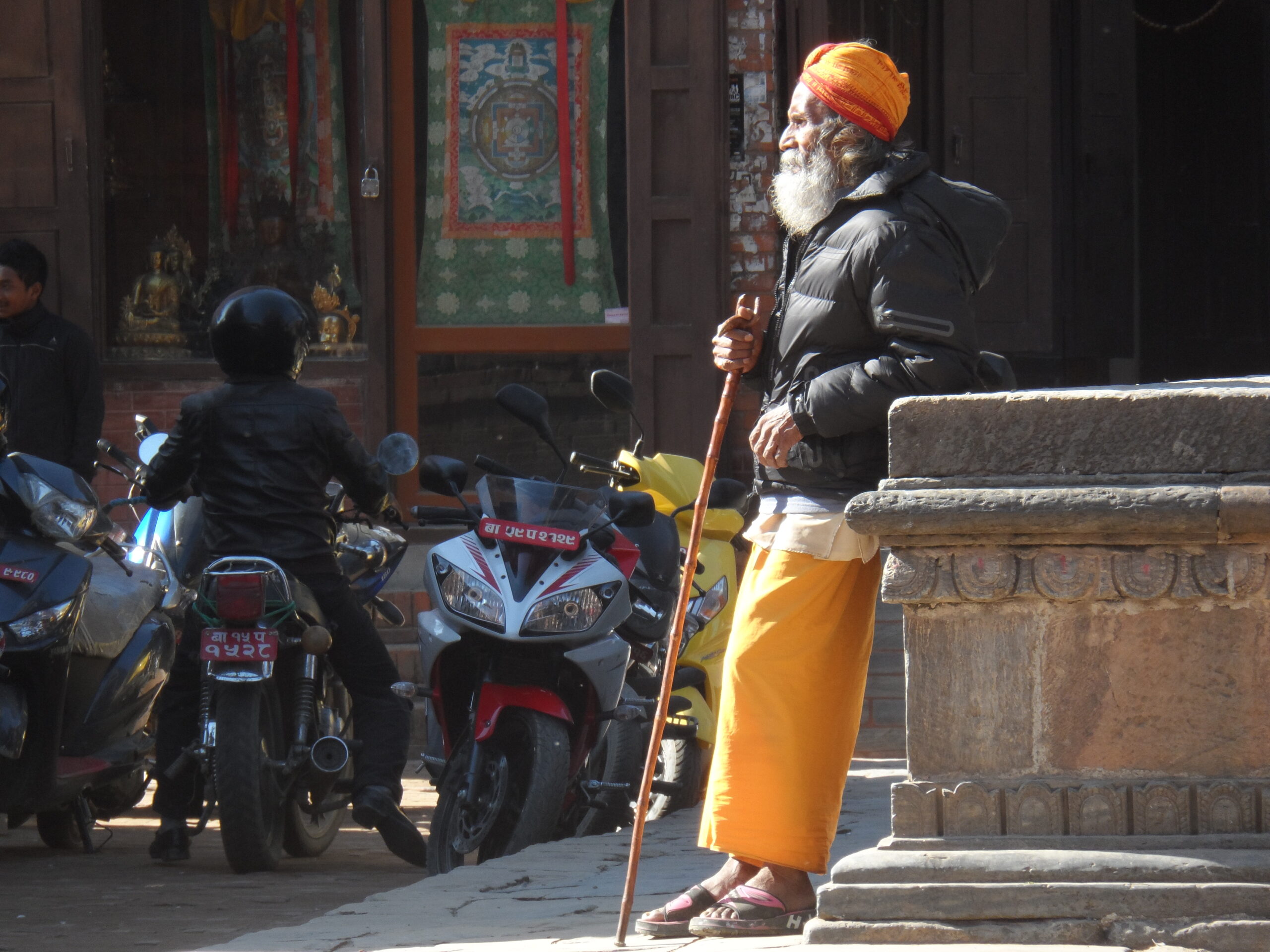 En la entrada de Patán hay dos dioses hindús. la gente pasa, los toca y los venera, alguien le ha puesto una túnica a uno de ellos. un vagabundo con unos zapatos del 47 esta siempre alrededor de estos dioses de piedra. llega un devoto, se reclina sobre la estatua, la toca con la cabeza, con las manos coloca una miga de pan en la boca de la deidad y luego coloca unas monedas detrás de la túnica. en cuanto se va, el vagabundo revisa que hay detrás de la túnica y se lo mete al bolsillo. saca de la boca del dios de piedra la miga de pan y se la come. mientras yo y un grupo de jóvenes nepalíes estamos sentados enfrente viendo como el señor se busca la vida.
