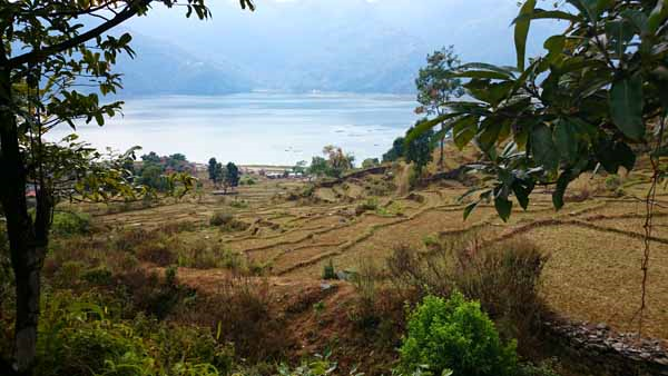 Veo un sendero que sube una pequeña montaña y hacia allí voy, y me empiezan a entrar los calores y me siento a ver las vistas que tengo. La vista del Lago Phewa es tan bonita que me quedo como tonto ensimismado hasta que unas gotas de agua en la cabeza me hacen despertar. No voy a seguir subiendo pues no se ve refugio. Así que regreso por donde vine pensando que los siguientes días dan buen tiempo y que hay muchas cosas que ver y que comer. Y en esas voy pensando mientras voy bajando.