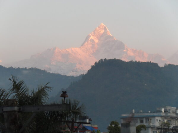 Sobre las nueve de la mañana salgo a tomar un café acá al lado, es caro. Me cobran un euro por el puto café. Por la habitación pago 7 euros, con vista a los Himalaya impresionantes, ver la foto desde mi balcón. agua caliente, una cama Queen, baño privado. Y por un café un euro y por una cerveza 4 euros. En fin. la vista es espectacular, El machapuchare se levanta como una pared con sus 6.993 metros de altura. es una montaña hermosa y prohibida para ascender. creo que solo te dejan llegar hasta los 3600 metros. nadie ha llegado a su cumbre. porque ? eso ya es otra historia que contare mas adelante.
